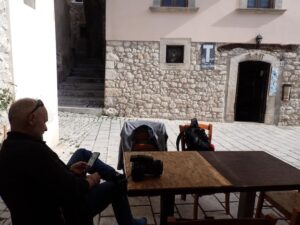 Die legendäre SS17 führt uns dann Richtung Castelnuovo – zu unserem heutigen Quartier – Agriturismo „Il pozzi dei desideri“. Gerne hätten wir das Ristorante auch genossen, aber wir befinden uns in der Nebensaison. Ristorante geschlossen aber unsere Gastgeber haben trotz Ferienwoche ein Zimmer mit Terrasse für uns vorbereitet. Ein Spaziergang in der Umgebung führt uns zu einem versteckten Tempel und einem Teatro – Peltuinum – eine antike Stadt – weitere „Überreste“ liegen auf unserem Wanderweg. Für ein Abendessen auf unserer „privaten“ Terrasse nutzen wir unseren Campingtisch und beim naheliegenden „Coal“ decken wir uns mit Salami, Oliven, Bruscetta und örtlichem Vino ein und genießen einen wunderbaren Sonnenuntergang.