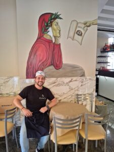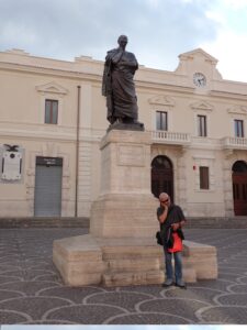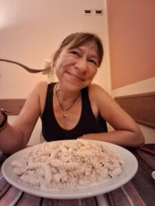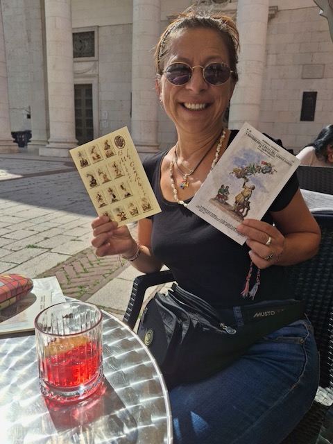 Confetti-Kühlschrank-Magnet:)! Ein Abendspaziergang im historischen Zentrum von Sulmona, Geburtsort von Ovid, beleuchtete Kirchen, eine Statue von Coelestin V – der erste Papst, der von seinem Amt zurückgetreten ist und ein Abendessen in der „Cantina di Biffi“ wo auch George Clooney gespeist hat: Großartiges Antipasto und Pasta Chitarra mit Zafferano und Cacio e pepe!!! Hinweis vom Wirt: Pasta Chitarra muß immer „fresco“ sein!!!! – mit Ei!!!