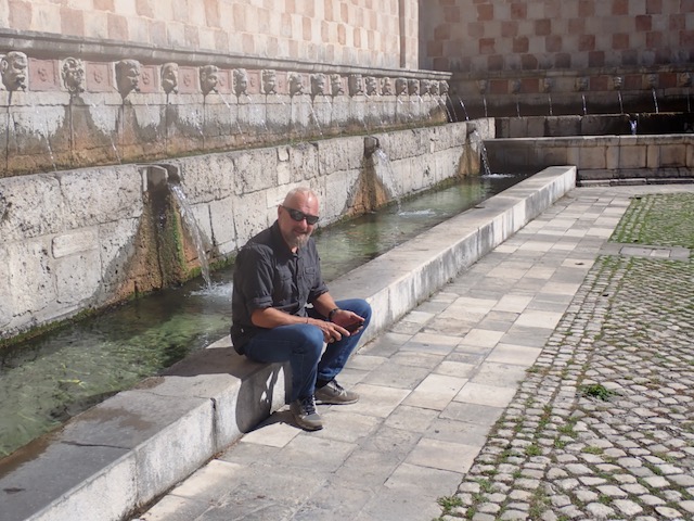 Fontana delle 99 Cannelle. Die Anfahrt ist „tricky“ aber schließlich befinden wir uns vor Ort – mittendrin in den magischen 99 Wasserspeiern. 99 ist die magische Zahl für Aquila – 99 Dörfer, 99 Burgen, 99 Wasserspeier…..
