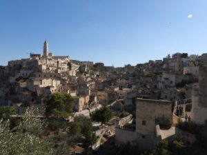 4. Oktober 2025: Wir verlassen Pompeji und – wieder der Sonne entgegen – geht es in die Region Basilikata – unser Ziel ist Matera – die Stadt der Sassi! Wir fahren durch eine landwirtschaftlich geprägte Provinz – unzählige Hügel – verfallene, verlassene Höfe, aufgelassene Bahnstrecken,… Matera war vormals das „Armenhaus“ Italiens und
