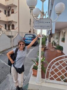 Wir haben uns für die nächsten Tage in unserem „Hochzeitshotel“ Baia degli Dei, direkt am Strand, eingemietet und an der Rezeption kann sich Melina noch mit großer Freude an
