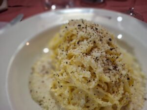 Spätnachmittags kommen wir an, Parkplatz passt perfekt und in unmittelbarer Nachbarschaft gibt´s ein tolles Restaurant – Il Conte Dino – was will man mehr! Das Essen ist ausgezeichnet: Milz vom Kalb, Frittierter Pulpo mit Kichererbsenpüree, Pici Pasta Carbonara mit Trüffel, Pici Pasta mit Wildschwein und ein rumgetränkter BABA – wunderbar, auch wenn der BABA ursprünglich aus Neapel kommt :)!