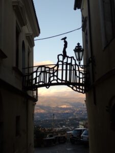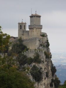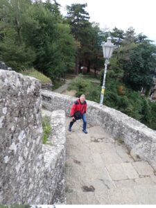 Zur Erkundung des historischen Zentrums San Marino starten wir vom parcheggio 11 los und nehmen die Seilbahn (Funivia) zur hochgelegenen Altstadt. Das Wetter ist etwas windig und frisch, aber gestärkt mit Espresso und Cappuccino schlendern wir durch die alten, kleinen Gassen, begrüßen das Denkmal des Ehrenbürgers Garibaldi (….er übrigens in jedem italienischen Dorf/Borgo zu finden ist :)), besichtigen natürlich die Basilica mit dem Thronsessel der beiden – jeweils für 6 Monate gewählten Regenten – und alle drei Türme, genießen die gigantische Aussicht und …. den „Passo delle Streghe“ … den darf man auf keinen