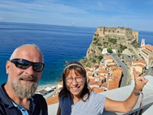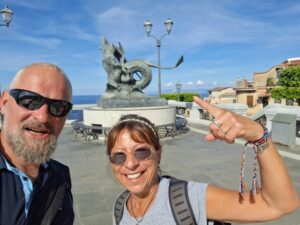13. Oktober 2025 – Abfahrt Hotel Baia degli Dei, wir verabschieden uns von Melina, starten früh los nach Messina, überqueren die Meerenge mit der Fähre – alles klappt reibungslos! Bei strahlendem Sonnenschein kommen wir in Kalabrien an und diesmal geht es wieder Richtung Norden. Unser erstes Ziel ist Pizzo an der Ostküste und wir