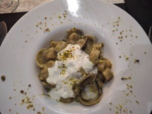 Borgo mit der obligatorischen Kirche und der örtlichen Bar, wo sich vor allem die älteren Herren einfinden und – man glaubt es kaum – ein Cafe noch 0,70 EUR kostet! Abends geht es dann bergab zum empfohlenen Ristorante – mit Fuchssichtung! Im „Lunapiena“ geht das Schlemmen weiter, diesmal mit Meeres-Antipasti und den hausgemachten Gnocchi mit Pistaziencreme, Vongole und Stracciatella die bufola!