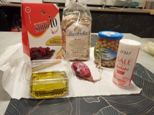 – Pasta Miskiglio (mit Kichererbsenmehl), Kichererbsen, den „einzigartigen“ roten Zwiebel und natürlich „Pepperoncini secci“ (getrocknete italienische Chillisorte) zum Drüberstreuen. Einfach und mit den lokalen Zutaten schnell zuzubereiten. Dazu Vino – Verbo (bianco oder rosso). Wir nutzen unser Quartier mit neu renovierter Küche und verwöhnen uns mit dieser speziellen lokalen Pasta – zur Verkürzung der Wartezeit: Taralli – leichtes Knabbergebäck, Cracker auf Weizenbasis – ähnlich Grissini!