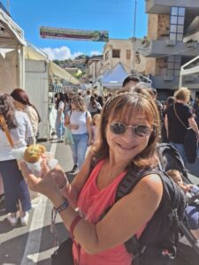 stoppen bei Quota-Mille, wo unser Hochzeitsessen stattgefunden hat und die Erinnerungen sind überwältigend!! Schließlich erreichen wir Bronte – und dort geht es ab! Nach einer, wieder mal, spektakulären Parkplatzsuche geht es ins „Getümmel“: An jeder Ecke Musik und Pistazien – in jeder Form: Pasta, Pesto, Crema, Cafe Pistacchio, Pistazienmehl – vom Frühstück bis zum Abendessen, ob süß oder pikant! Und dann noch umwerfende Arancini mit Pistacchio !!!!!! Wir füllen unser Auto mit weiteren Spezialitäten und fahren unsere Etna-Runde über Catania zu Ende – bis wir nach Giarre kommen – denn heute haben wir noch einen weiteren wichtigen Termin :)!!!!!
